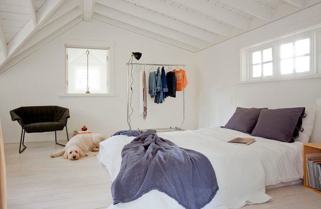 В брутальном лофте можно позволить себе и одежду на стремянке. Впрочем, аккуратнее — так мы и до стула скатимся.