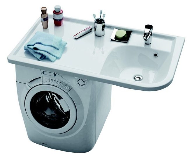 Для гармоничного объединения чаши рукамойника и стиральной машины, первые бывают специальной конструкции. Раковина имеет большую столешницу – «крыло», под которую и помещается постирочная техника.