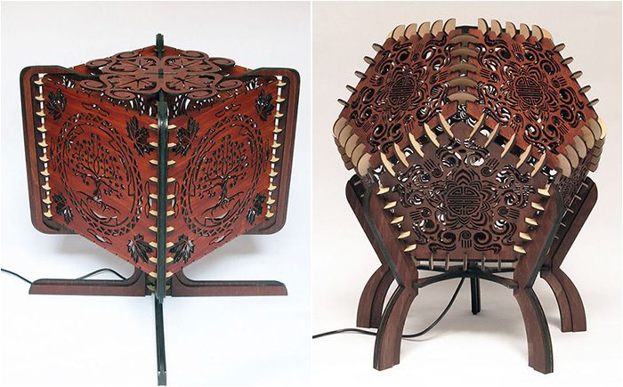 Дизайн придумывается в компьютере, затем отправляется на лазерную установку, где вырезаются все детали. Собираются, склеиваются и лакируются лампы вручную. Выпускается две серии, одна посвящена «дереву жизни», вторая – геометрическим узорам и символам.