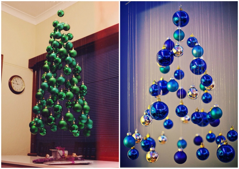 Подвесьте на леске елочные шары, имитируя форму елки. Нарядно и очень необычно.