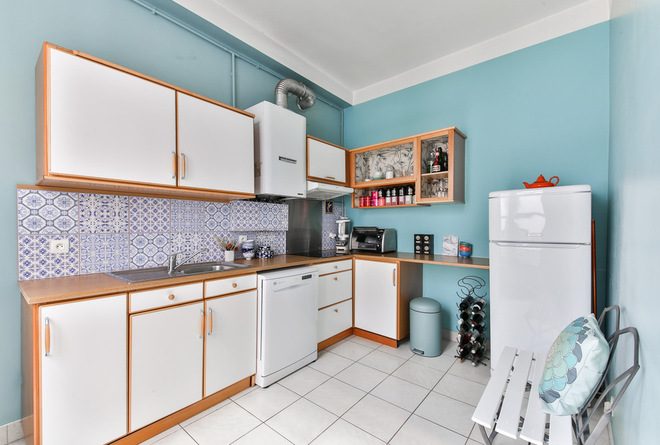 А вот еще одна идея из Франции — на этот раз, скорее, женская. На кухне есть открытые подвесные ящики? Их внутреннюю поверхность можно разнообразить за счет цветных обоев.