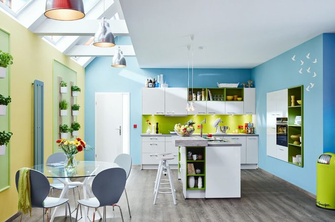 Сама кухня радует глаз разными деталями — от сочетания ярких оттенков до вертикальных фито-композиций, но мы хотим обратить внимание на скромный фрагмент — белые силуэты птиц под потолком.