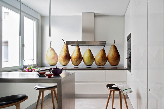 Заказать эффектный фартук для кухни — один из самых простых и действенных способов разнообразить монотонный интерьер. Термостекло с флористическим принтом, керамогранит под бетон, плитка-пэчворк — из многообразия вариантов несложно найти тот, который окажется по душе и по карману. В этом испанском проекте дизайнеры сделали ставку на спелые крупноформатные груши и сопровождающий их вау-эффект.