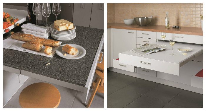 Удобно, когда есть возможность скрыть стол, и доставать его при необходимости. Для этих целей подходят модели, спрятанные в гарнитуре. Хорошо, если стол на ножках оснащён колёсиками. Это ускоряет и облегчает процесс его использования.