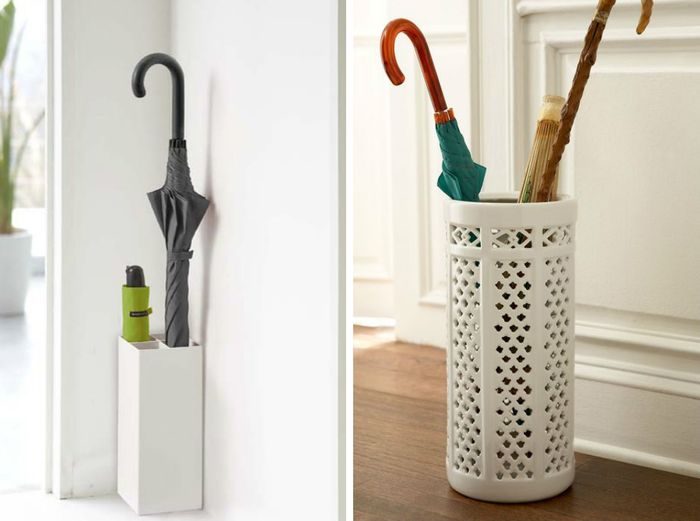 Зонты могут стать хорошим украшением интерьера прихожей. Для их хранения лучше применять специальные зонтницы. Сегодня есть варианты даже для малогабаритных помещений. Если же органайзера нет, то зонты можно поместить на вешалку для одежды – повесить на крючок или положить на верхнюю открытую полку.