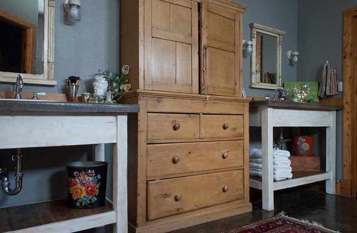 В своей ванной комнате хозяева установили два туалетных столика по высоте, которая соответствует отдельно каждому супругу. На полках столиков супруги хранят полотенца и другие вещи.