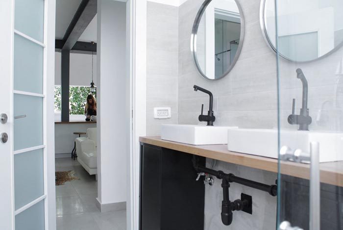 Небольшая по площади ванная комната принадлежит Нофар и Джонатану Дар. Здесь удалось установить два умывальника, а незамаскированный водопровод помогает создать в помещении атмосферу промышленного стиля.