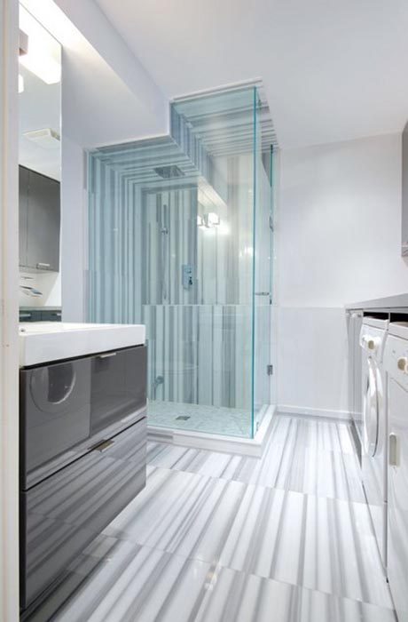Ванная комната, в которой нашлось место и для прачечной, может похвастаться оригинальными шкафчиками и туалетным столиком, графической плиткой на полу и душевой.