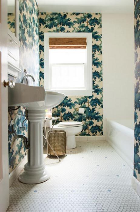 Дизайнер интерьера Хелен Говард превратила блеклую ванную комнату в своем калифорнийском доме в яркое, динамическое пространство с помощью обоев с ярким рисунком и латунных аксессуаров. На полу в ванной осталась старая плитка, которая здесь со времен строительства в 1928 года.