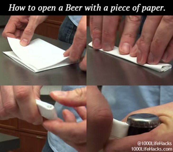 9. Под рукой не оказалось открывашки, и нечем открыть бутылку пива? Сделайте свою собственную открывашку из… листа бумаги! Вот так: