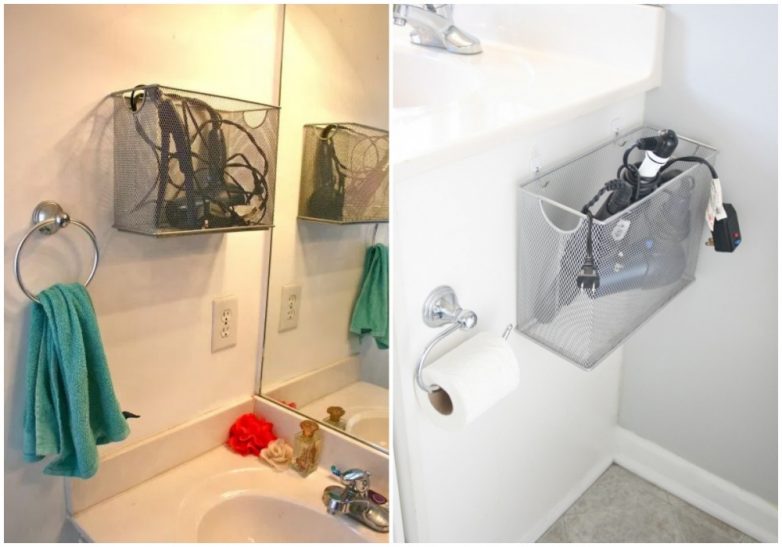 Металлическая корзина, прикрепленная к стене или боковой поверхности шкафа, решит проблему с хранением вещей в маленькой ванной.