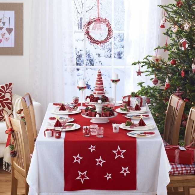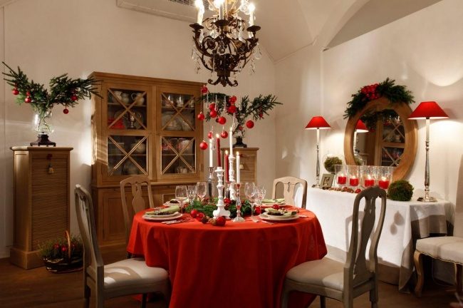 Для того чтобы не менять привычную обстановку, но вместе с тем внести торжественную нотку, купите ароматные свечи, несколько еловых веток, сервируйте стол с помощью ярких салфеток. Все эти аксессуары довольно стильно сочетаются и могут использоваться отдельно.