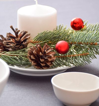 Установите свечу на блюдце, разложите лапник на переднем плане, декорируйте елочными шариками и шишками.