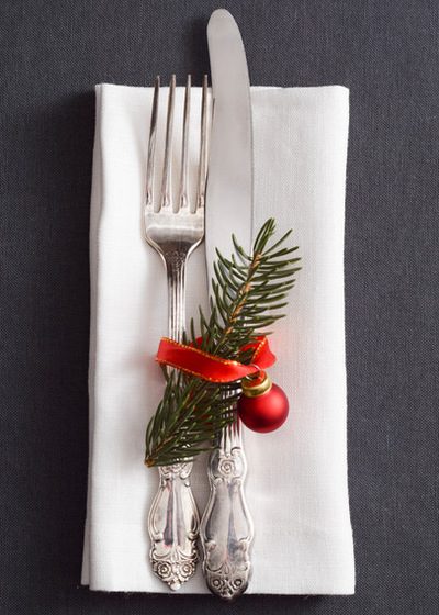 В отличие от предыдущего варианта сервировки, когда вы украшали новогодней композицией салфетку, сейчас — украшаете хвойной веточкой. И проденьте приборы в ленту от шарика. Готово!