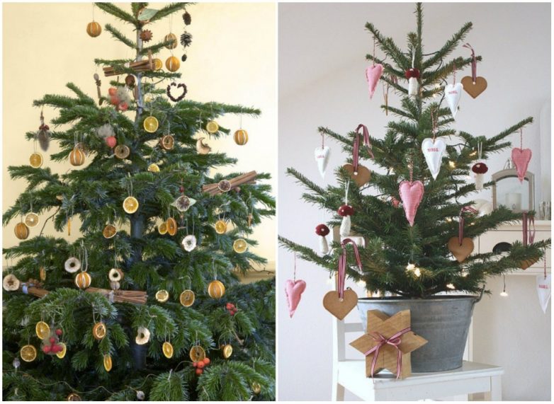 Если у вас нет проблем с фантазией, то, наверное, вы и сами придумаете, чем бы этаким украсить елку: например, это могут быть красиво высушенные фрукты или имбирное печенье, поделки, самодельные игрушки, открытки… Пусть эта елка на все сто процентов отразит ваши творческие способности!