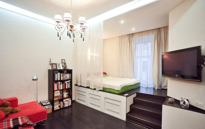 Недаром говорят, что всё гениальное – просто. Современные дизайнеры нашли компактное решение для небольших пространств – подиум. На нём можно разместить рабочий или игровой уголок, спальное место, а также удобные места для хранения вещей. Также это отличный способ зонирования пространства. В результате, отпадает потребность в шкафах, комодах, тумбочках. Подиумы можно делать самой разной высоты.