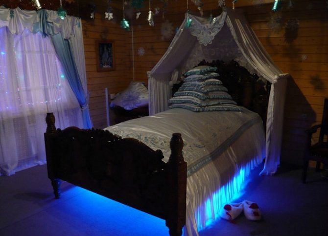 Есть в спальне ещё один секрет – в ночное время кровать здесь светится, что позволяет создать волшебную атмосферу. Этот приём вполне можно использовать и в самой обычной спальне, что позволит сэкономить на прикроватных светильниках.