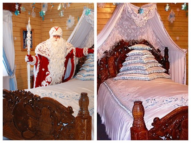 На какой перине спит Дед Мороз и сколько у него подушек? Центральное место в спальне отведено удивительно красивой кровати, изготовленной из дерева. Зона изголовья выделена белоснежной тканью с узорами. Она гармонично перекликается с покрывалом. На кровати лежит чудесная перина, только она сделана не из перьев, а из ароматных трав. Это позволяет Деду Морозу спать спокойно. Семь подушек сложенные друг на друге не только украшают интерьер. Оказывается, все они предназначены для разных дней недели.