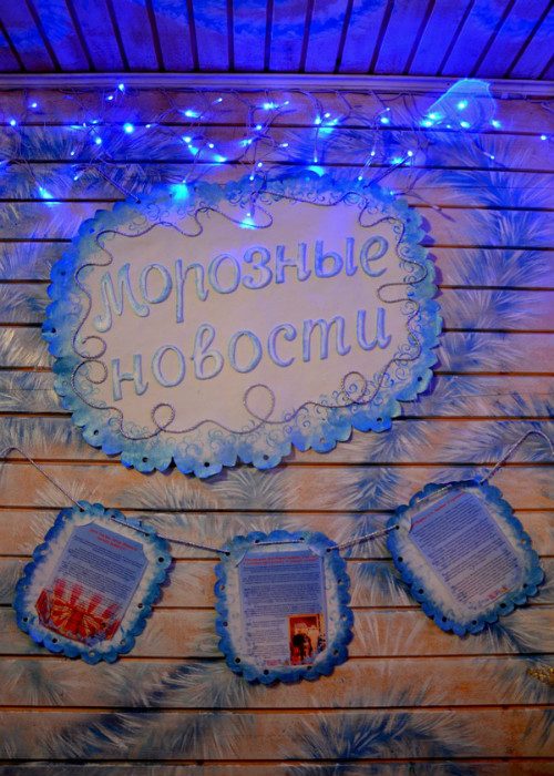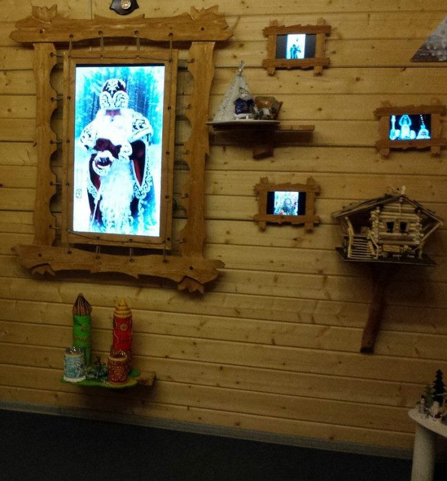 Стоит ещё обратить внимание на стены, декорированные фотографиями Деда Мороза. Они светятся и создают загадочный эффект. Особенно необычно выглядит большой портрет Деда Мороза, где он словно с улицы заглядывает в окошко.