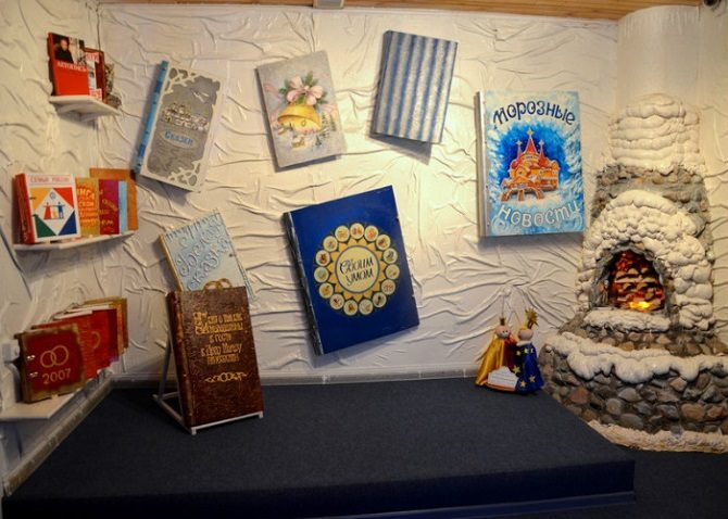 Есть и тереме Деда Мороза и детская библиотека. Она занимает часть стены в одной из комнат. Поверхность, на которой располагаются книги, имитирует лёд со снегом. Но такой холодный элемент удачно разбавлен стилизованным камином.