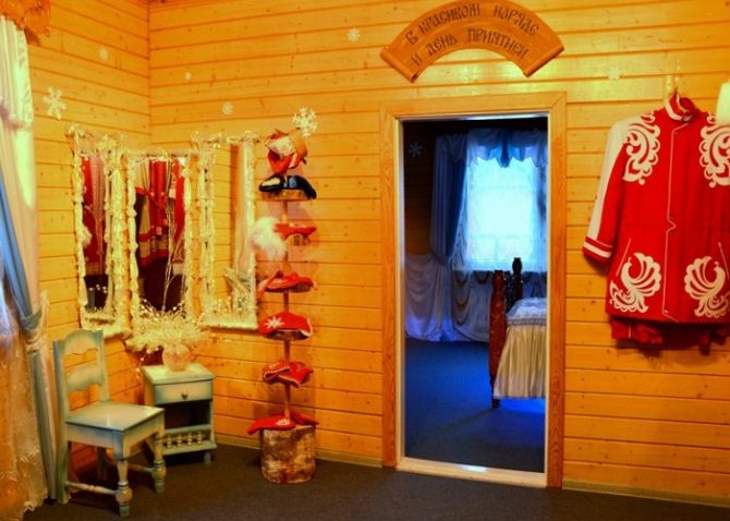 Так как нарядов у Деда Мороза немало, для них отведена специальная комната. Интересно, что в ней нет привычных шкафов. Зато она оборудована специальными крутящимися элементами, что позволяет очень быстро находить нужный наряд. Также в комнате есть уголок с зеркалом, как и положено в гардеробной.
