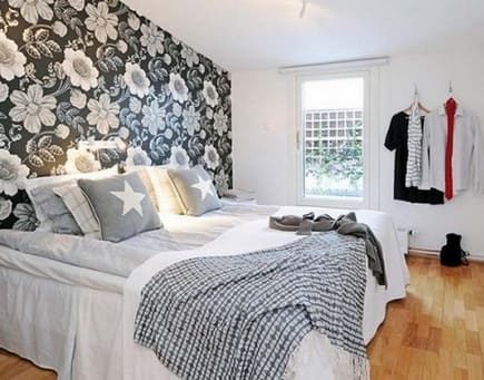 Отличные компаньоны для обоев в цветочек — однотонные обои. Так же неплохо смотрится клетка и полоска.