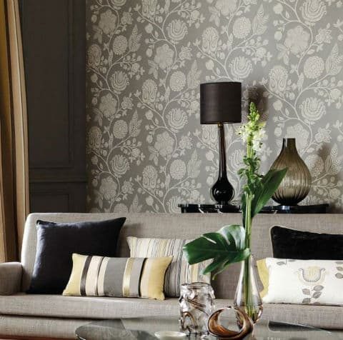 Кстати, они сейчас на пике популярности. Мне они очень нравятся. Выглядят они эффектно. Чаще можно встретить светлые или темные обои с серебристыми, золотистыми, белыми, серыми цветами. Но можно найти и цветочные обои в золотисто-шоколадной гамме, в синих или зеленых оттенках.