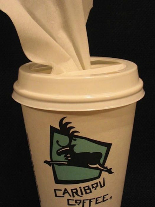 Используйте обыкновенный кофейный стаканчик с крышкой для хранения влажных салфеток. Стакан можно поставить в подстаканник, чтобы салфетки всегда были под рукой.
