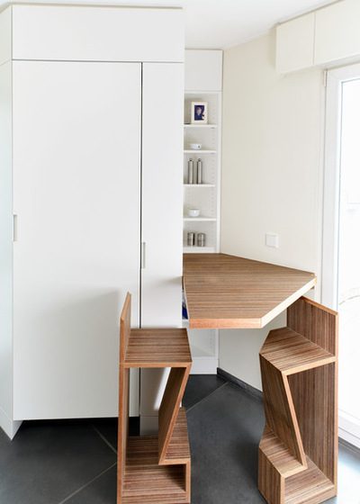 Стеллаж для напитков может быть частью ансамбля — барной стойки и стульев, как в этой мюнхенской квартире.