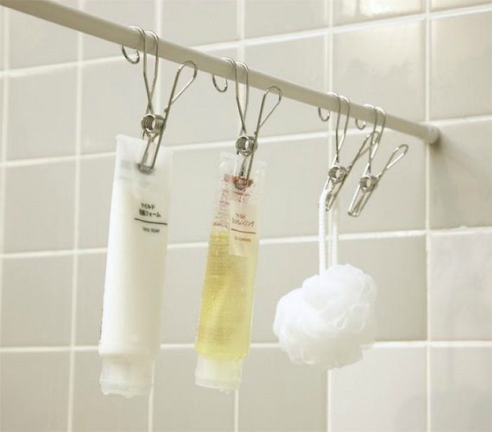 Шампуни, гели для душа и мочалки можно повесить на карниз для шторки в ванной.