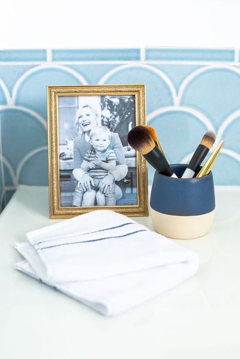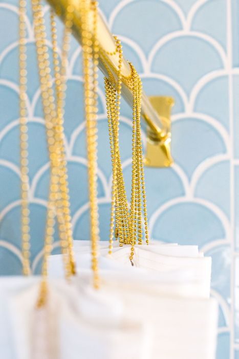 Для оформления ванны дизайнер выбрала белый и голубой цвета Эмили любит светлые и чистые оттенки, поэтому для интерьера маленькой ванной она выбрала голубой и белый цвета. К тому же, такая гамма облегчает и зрительно расширяет пространство, словно наполняя его воздухом. Также голубой оттенок отсылает к морской тематике, которую поддерживает и чешуйчатая форма керамической плитки.