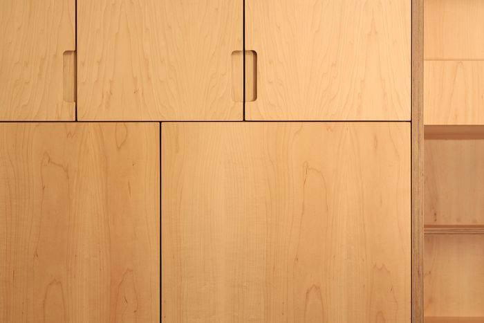 Спальню дизайнеру удалось отделить от кухни при помощи фанерной конструкции. Она же выступила в роли системы хранения и рабочего места. За счёт такого функционального и лаконичного элемента зона отдыха получилась уединённой и очень уютной.