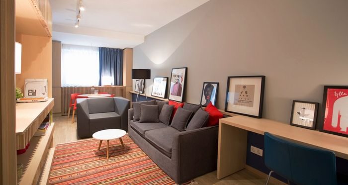 Дабы зрительно сделать узкую зону гостиной шире, на пол положили ковёр с горизонтальными полосами активного красного цвета. В первую очередь, это задало определённую динамику в пространстве. Помимо этого, такой приём позволил визуально раздвинуть стены. Для создания пропорциональности комнату украсили постерами в квадратных рамах и остановились на мебели геометрических форм.