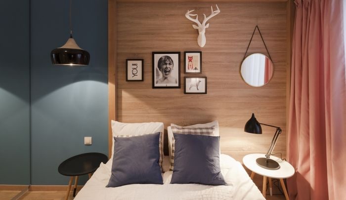 В небольшой спальне встретились сразу несколько цветов, которые делают комнату не только стильной, но и визуально просторной. Холодный оттенок фуксии зрительно отвлекает от истинных размеров комнаты, а синий работает на увеличение пространства. Разбавляет холод этих колеров деревянная отделка изголовья и вязаный текстиль на кровати. Ещё один полезный приём для маленькой комнаты – шкаф-купе с зеркальными дверцами. Он позволяет решить сразу несколько проблем: избавиться от чувства тесноты и спрятать все вещи с глаз долой.