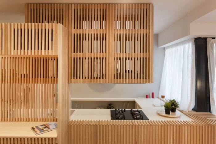 Старая планировка была совершенно неудобной, поэтому от неё в квартире практически ничего не осталось. Не стали трогать лишь несущие стены в спальне и санузле. От коридора вообще решили избавиться, приплюсовав его площадь к зоне гостиной-кухни. Кстати, в этой малогабаритке хотели уйти от студийного пространства, поэтому зоны кухни и гостиной разделили при помощи фанерной перегородки, которая также выполняет роль стеллажа и кухонного гарнитура. Конечно, такое зонирование сделало обе части комнаты зрительно узкими, но бороться с этим решили декораторскими приёмами.