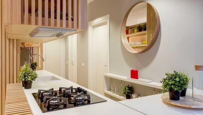 На кухне же всё организовали максимально просто – фанерная мебель, белые глянцевые фасады, лёгкий текстиль на шторах и много света. Безусловно, все эти элементы влияют на положительное восприятие интерьера.