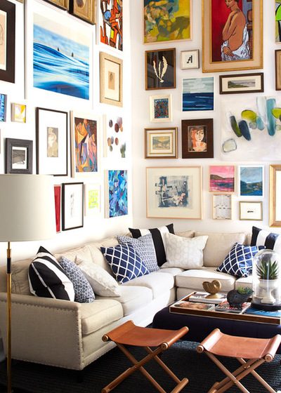 Если же у вас в гостиной высокие потолки, используйте это преимущество по полной! Конечно, вытянутое вверх помещение не означает больше места для гостей, зато так создастся ощущение, что комната намного больше, чем кажется на первый взгляд. Превратите высокие стены в домашнюю картинную галерею.5. Заполните пространство в углу