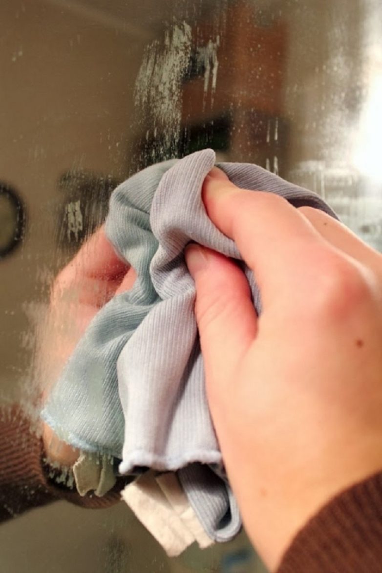 Результат — сияющее стекло без разводов. Благодаря этому трюку зеркало в ванной не будет запотевать ни при каких обстоятельствах!