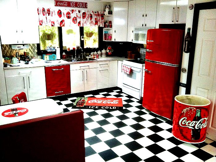 Яркая и молодежная кухня с дизайном в стиле Coca Cola.