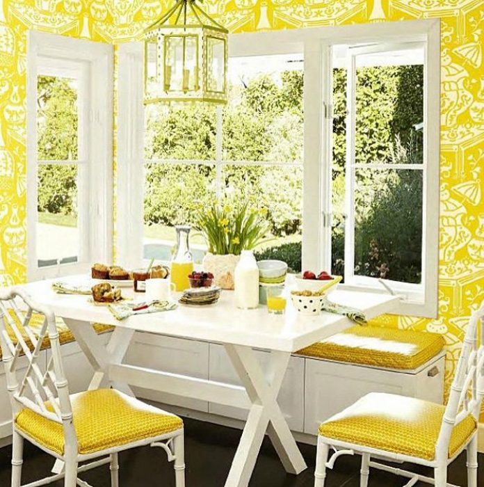 Солнечная кухня, оформленная в бело-желтых тонах, что делает ее максимально просторной и свежей.