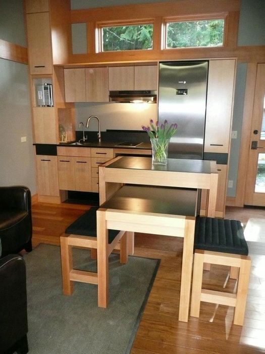 В крошечной квартире вся мебель должна быть максимально функциональной и мобильной. Поэтому специалисты в сфере дизайна интерьеров рекомендуют обращать внимание на мебель-матрёшку, когда один предмет может спрятаться в другой. С такой мебелью экономится место и интерьер не выглядит загромождённым.