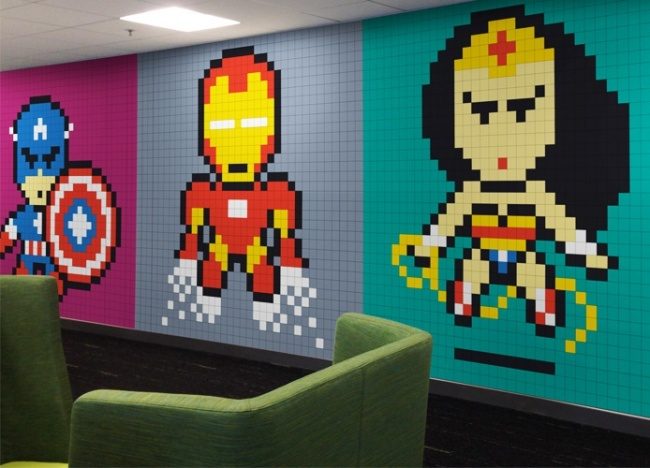 Оформление стен квадратными стикерами — решение для истинных ценителей восьмибитной культуры.