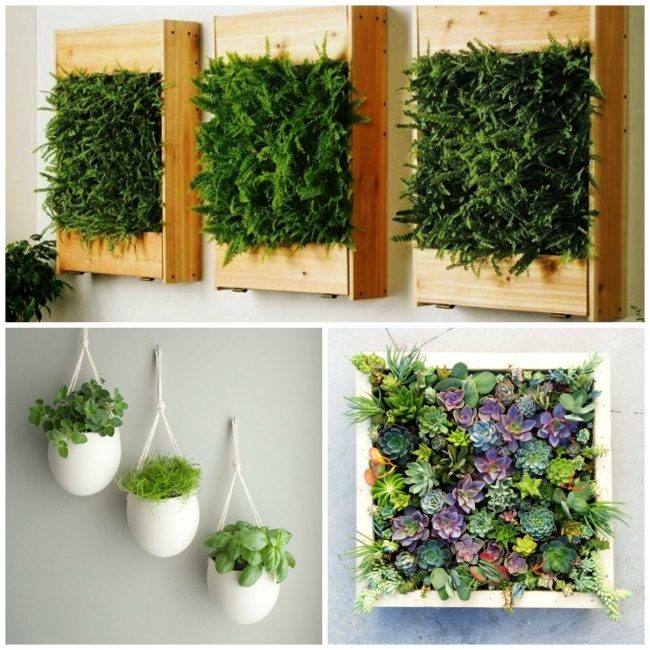 Оживить стены растениями и цветами вам помогут деревянные поддоны и ящики, а также специальные настенные вазы и модульные горшки.