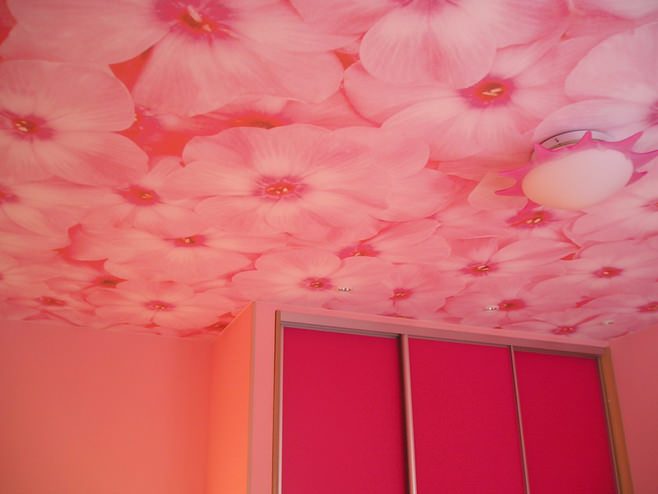 Необычный потолок с использованием фото обоев.