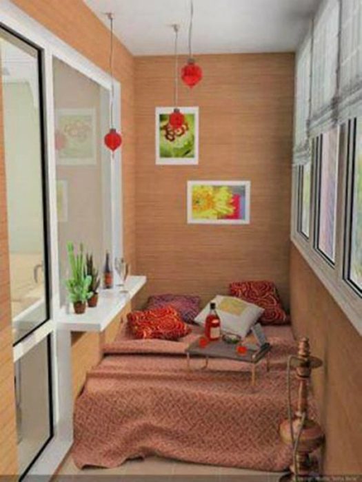 Превратить лоджию в уютное место для отдыха можно, постелив на пол матрас. Это потрясающая идея особенно актуальна для душных летних ночей.