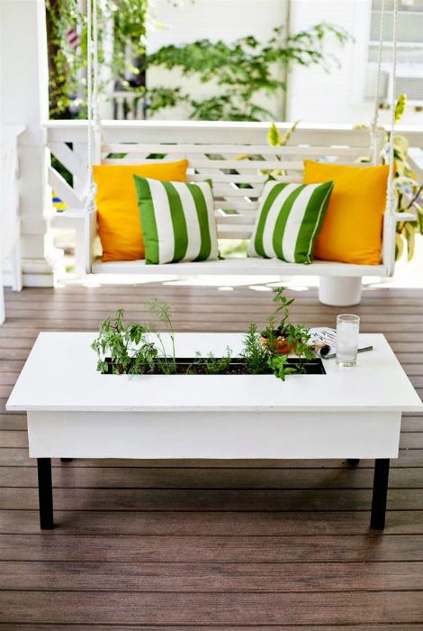 Потрясающая идея для лоджии — журнальный столик со скрытым лотком для выращивания любимых растений прямо посреди столешницы.