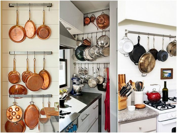 Удобно хранить кастрюли на рейлингах с крючками. Их можно установить куда угодно – на стену, над окном и даже закрепить на мебели. Но если нет возможности приобрести подобное приспособление, то его не сложно сделать его своими руками из подручных материалов.