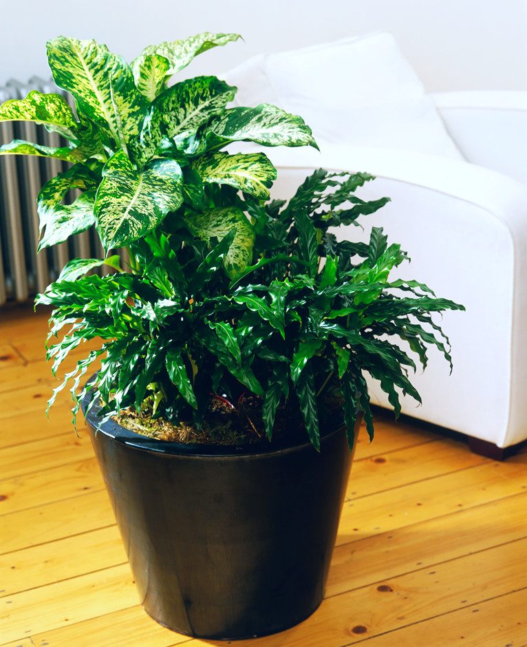 Диффенбахия. Диффенбахия быстро растет, поглощает вредные вещества из воздуха и радует глаз листьями красивой окраски. Правда, в обращении с ней нужно соблюдать осторожность — сок диффенбахии ядовит. Вырастает этот цветок в домашних условиях до 2 метров. Для сохранения пестрой окраски листьев цветку необходим хороший уровень освещенности, даже осенью и зимой. Летом растение нужно притенять, чтобы прямые солнечные лучи не сожгли нежные листья. Сквозняков эти комнатные цветы не любят и могут в «знак протеста» даже сбросить нижние листья. Весной и летом диффенбахии необходим обильный (2—3 раза в неделю) полив, зимой — не чаще 1 раза в 7—8 дней. Опрыскивать отстоянной водой цветок можно хоть каждый день.