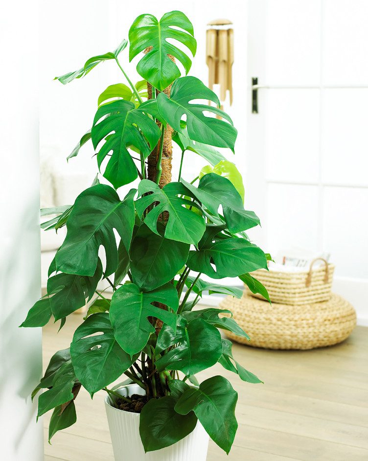 Монстера. Крупное тропическое растение, красивое и достаточно неприхотливое. По мере взросления на его листьях появляются дырки, которые позже преобразуются в разрезы. Растение очень теплолюбиво, зимой нельзя допускать снижения температуры в помещении ниже 17 градусов. Лучше всего растет на солнечном месте, без воздействия прямых солнечных лучей. Монстеры имеют свойство быстро расти и очень сильно разрастаться. Высота растения может достигать 5 м. Влаголюбиво, необходим обильный полив, но между поливами почва должна подсыхать.