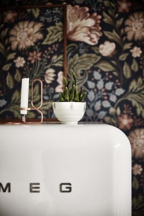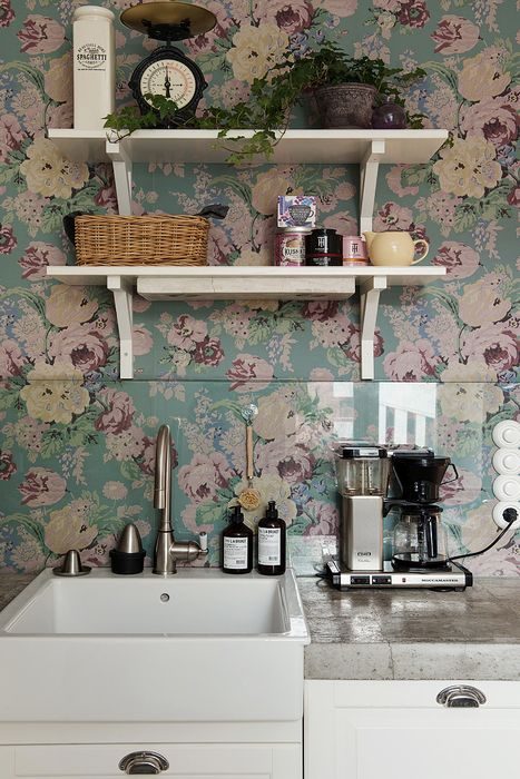 Первая кухня, которая привлекла моё внимание, выполнена весенней атмосферой. Такой эффект получился благодаря тому, что белую цветовую гамму разбавили обоями с нежным флористическим мотивом. Такой тип отделки вообще редко встречаются на кухне, многие предпочитают просто красить стены или выкладывать их плиткой. Но для этой кухни выбрали водостойкие моющиеся обои, которые отлично переносят перепады температур и воздействие влаги.